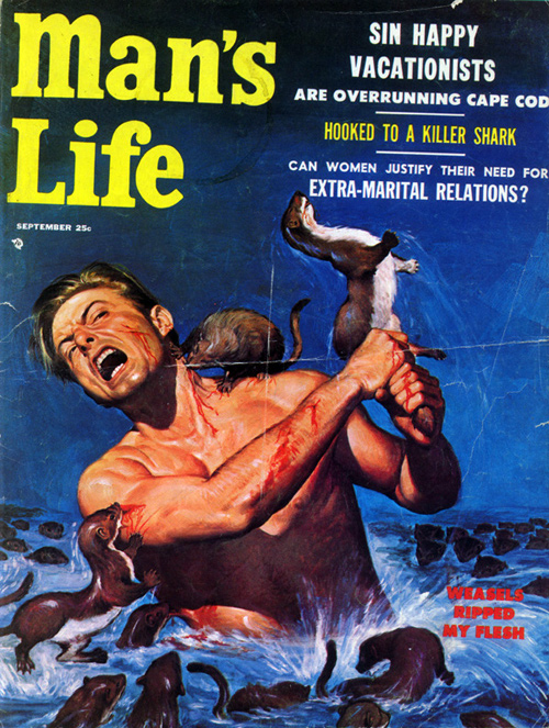 It’s too much of a good thing, and I find myself drinking it in by portions. My favorite part of the book thus far – and it is arranged by themes – is “Animal Attacks”. I had no idea that the phrase “Weasels Ripped My Flesh” originated on the cover of a man’s magazine – but there it is, with the cover art to match. Add to the mix of b-movie horrors detailed within this chapter attacks by vicious swarms of flying squirrels and spider monkeys. I had no idea snapping turtles traveled in herds.