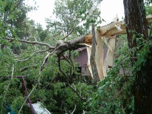 At about 4:30, we had the second noise. We didn’t know it at the time, but that was a giant hand reaching down from the heavens and applying a purple nurple to the large chinaberry tree in our back yard. The poor thing shattered, and missed our house by literal inches. In fact, leaves from one of the upper boughs were pressed against one of our windows.