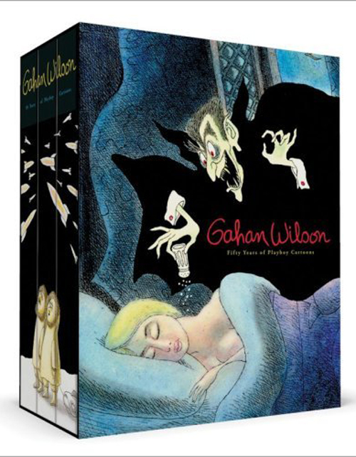 If you’re one of the three people reading this blog, you know Gahan Wilson. If not: his heavily cross-hatched cartoons epitomize bizarre, black humor. Or to put it another way, he’s the one who’s not Charles Addams. In Hugh Hefner’s intro to the first volume, he talks about looking for a Charles Addams-type for his fledgling Playboy (Addams being under exclusive contract to The New Yorker), and finding Wilson in Colliers. Thus begins the legend.