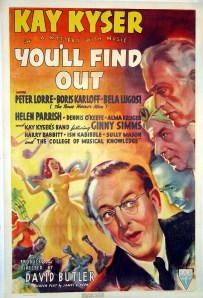 1. Eight year old me is in total agreement on YOU’LL FIND OUT, but 42 year old me has softened on the movie considerably. (http://www.bmp.stomptokyo.com/3btheater/y/youfindout.html) Still wish Karloff, Lorre and Lugosi had that rumored musical number. If nothing else, take comfort in the fact Kyser was disintegrated in the end.