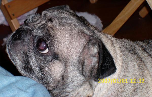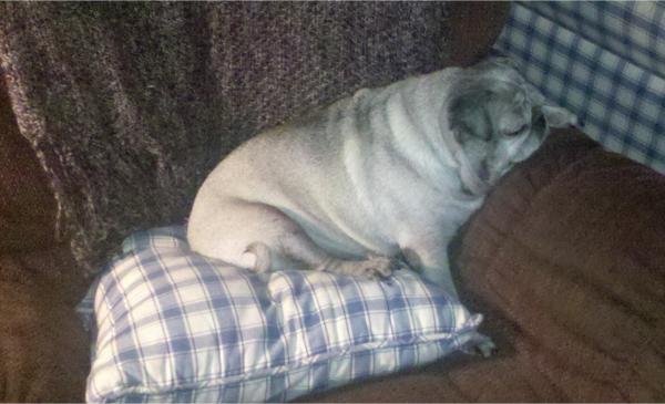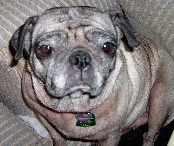 old pugA couple of days later, Max was home because they were testing at his school, and it wasn’t his day to test. Mavis had another seizure, and Brownie started howling, and Max reasonably enough freaked out and called his mother, who called me. I was already leaving work. I got home and Max was sitting with her; she was in her bed, and seemed alright, but over the last few weeks her breathing had become more labored. As someone with no appreciable nose myself, I can tell you that breathing is a chore anyway, but this was something new, and more difficult. She had been spending more and more time in her bed, only lying down to sleep. The rest of the time she sat up, because breathing was easier.