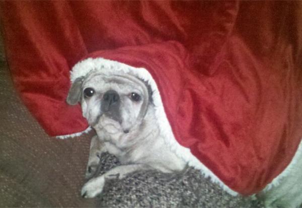 santa pugYears passed. We got older, and so did she. She wasn’t able to jump up into my lap anymore, so I gladly lifted her up. More and more often, she wanted to end her walk early, and sometimes I had to carry her home. Eventually she grew to prefer just going out into the backyard, doing her business, and barking at the local squirrels.