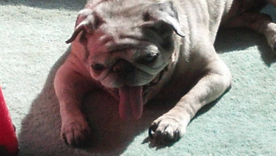 sunbathThey say that dogs were put on the Earth to teach us that unconditional love exists, and to show us what it looks like. Mavis was part of my life, a part of my family for 12 years. Max can’t really remember a time without her.  I miss her. I miss her reedy little bark, I miss her smile, I miss her stench when she went too long without a bath, I miss her snoring, I miss her sneezing, I miss that bizarre sound, between a bark and a howl, that she made when I came home too late at night. I miss her sitting at the top of the stairs, looking down into the living room, trying to look like the Hound of the Baskervilles but failing because she was a lovable little pug dog with a goofy face. I miss going into the kitchen and having her immediately start hoovering and snurfling around while I misquoted a line from the show that Lisa and I met during, saying “Pug dog, you are hideously in the way.”