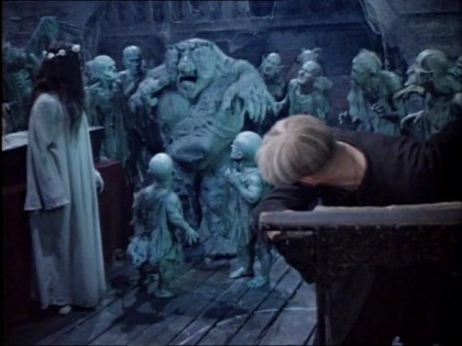 When Walker promises to bring some professor types to vet Ace’s zombie, things get heavy for Brown and Carney, who are forced to board a ship bound for the mythical island of Saint Sebastian, to return with a real zombie or face Ace’s rather drastic consequences. You’ll recognize Saint Sebastian from the aforementioned I Walked With a Zombie. Those seem to be the same sets, too, and oh look, there’s Sir Lancelot, King of the Calypso, acting as a Greek chorus when the boys get off the ship.