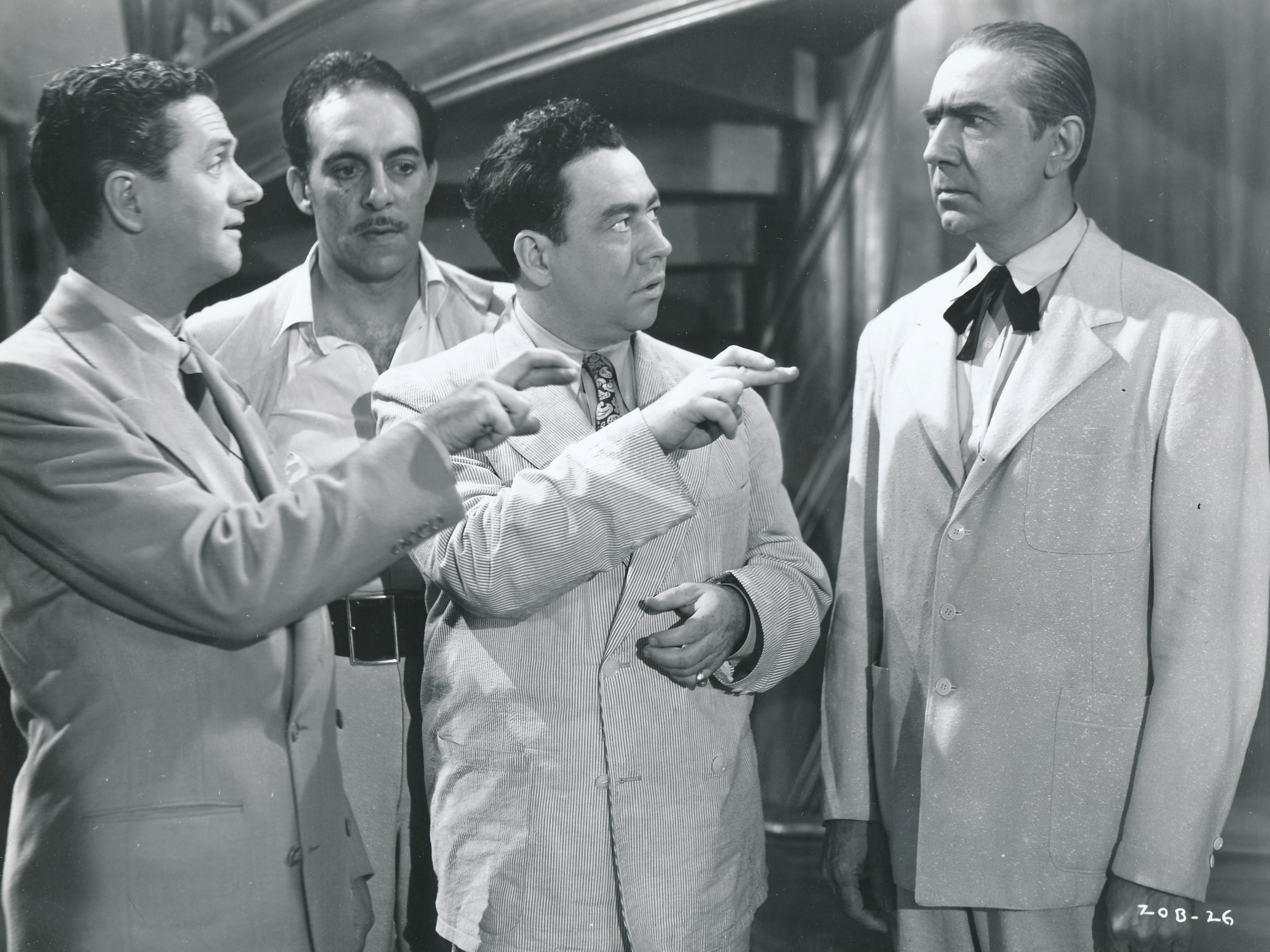 …the first was the brilliant idea to advertise that a “real zombie” would appear at the club’s opening. The second is basing their radio campaign on a broadcaster who turns out to be Ace’s bete noir, Douglas Walker (Louis Jean Heydt) a weisenheimer crusader type who delights in needling the mobster on the air. This is like asking Jon Stewart to publicize Bill O’Reilly’s new country club. And worse yet, Walker knows the washed-up prize-fighter the boys intended to pass off as a zombie.