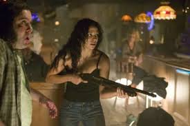 The thing is, those supers also lie, as this guy who just came in the door is named “Hero” (Eric Dane), and he tells the assemblage in the bar that “I’m the guy that’s gonna save your ass,” just in time for a monster to reach through a nearby window and rip his head off – with a Wilhelm Scream, of course. (The supers also tell us of one character, Beer Guy (Judah Friedlander), “Losers and dorks die first, and he’s both”, and he winds up surviving until the final battle). Then, in the first assault on the bar, a child is killed, and you’ve been served notice that all bets are off and anybody can die.