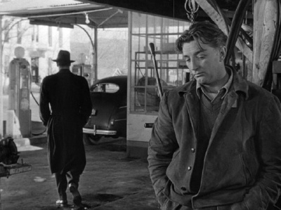 In this, another Jeff (Robert Mitchum), the owner of a gas station in a small California town, is confronted by Joe (Richard Webb), a man in a tellingly dark trenchcoat and hat, who knew Jeff back when and insists he come to a meeting with a former employer. Jeff’s calm life as a working joe and his budding romance with local girl Ann (Virginia Huston) is suddenly upended, and he confesses to Ann his past life as a detective, hired by a mobster, Whit (Kirk Douglas) to track down a woman who shot him and stole $40,000 before vanishing.