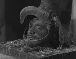 We start with those fun-loving Aztecs, as their high priest Xiu (Guillermo Kramer) sacrifices a guy for causing the death of their mightiest warrior, Acatl (Mauricio Garcés). In fact, all that’s left of Acatl is his head, in his ceremonial headdress. Xiu hands off the Ring of Death to the High Priestess (Ana Luisa Pellufo), and informs her that she and he will be hanging around Acatl’s tomb for eternity. Then he curses anybody who profanes the tomb, and gets sealed in.