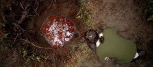 Jug Face starts with the neat trick of giving us the backstory during the opening credits (in my experience, only used heretofore in The Boogens, Screams of a Winter Night, and The Incredible Hulk). Presented in Grandma Moses-style rustic art, we’re given a backwoods community being ravaged by some sort of pox. One fellow makes an urn out of clay from a nearby pit; the urn bears the face of the local clergyman, who is sacrificed bloodily to a nearby pit, and everyone is cured.