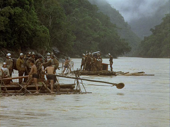 The raft-borne party is almost immediately in trouble, encountering rapids that leave one raft trapped in an eddy against a cliff wall, and this is where the true power of Herzog’s approach is revealed: those are his actual actors on the rafts, in the rapids, and his actual cameras. Though you can never claim the movie employs a documentary approach, there is a visceral, fearsome quality to the footage that cannot be matched.