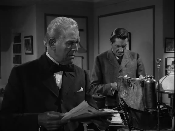 Karloff plays James Rankin, a successful novelist and social reformer in 1880 London. His newest project concerns one Edward Styles, a one-armed man hanged twenty years earlier as the Haymarket Strangler (before you ask the very same question I did, his victims were only “half-strangled, then slashed to death”). Rankin feels that Styles was railroaded, and his research puts him on the trail of a Dr. Tennant, who autopsied the Strangler’s victims and seemed to know far too much in his reports. Tennant disappeared soon after Styles’ execution, and Rankin discovers the missing doctor’s kit, which has its scalpel just as obviously missing.