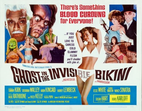 An unofficial policy is that I have at least one Boris Karloff movie per Hubrisween, and I found to my horror that I had not included one in this year’s lineup (although I somehow managed to schedule four, count”em, four Paul Naschy movies). So imagine my surprise and delight and downright relief when I discovered that in the years and years since I had last seen Ghost in the Invisible Bikini I had somehow conflated it with How to Stuff a Wild Bikini, and instead of Buster Keaton, I got Boris Karloff. I never thought I’d be so happy to miss out on Buster Keaton.