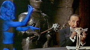 Ripper’s plan also involves his daughter Sinestra (Quinn O’Hara) seducing and murdering Bobby, much to the disgust of Bobby’s girlfriend Vicki (Nancy Sinatra!). When the truly lovely Sinestra, a redheaded knockout, is introduced, Ripper commands her to take off her glasses. As all right-thinking Americans know, eyeglasses only serve to make women super-hot, so all this does is verify Ripper’s villainy in our eyes. Actually, it saves Bobby’s life at least twice, as Sinestra has the Velma problem, and keeps killing statues and suits of armor instead of Bobby.