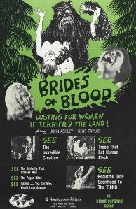 Okay, to indulge another of my personal failings – the digression – it’s not actually the first, that honor falls to 1959’s Terror is a Man, aka Blood Creature, which is a surprisingly effective Dr. Moreau rip-off starring Francis Lederer. It is the first of co-directors Gerardo deLeon and Eddie Romero’s movies to use Blood Island as a setting, which must be the most screwed-up place on the planet to live, right up there with Voodoo Island and Skull Island. But this is almost a decade before Brides of Blood, it’s in black-and-white, and it is never marketed with its colorful, far more garish descendants. Rather a pity.