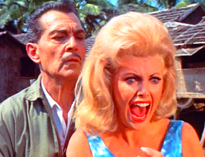The archetypal tramp freighter is making one of its infrequent stops at Blood Island, and it’s dropping off Jim (John Ashley), a Peace Corpsman, Dr. Paul Henderson (Kent Taylor) and his oversexed wife Carla (Beverly Hills, or Beverly Powers, depending on where you are in her filmography). Jim is there to do Peace Corps stuff, and Dr. Paul is studying the possible effects of radiation from bomb tests on the local fauna. Carla is largely there to set feminism back for decades, starting with an attempted rape by one of the sailors on the boat that she starts to enjoy and then become an active participant.