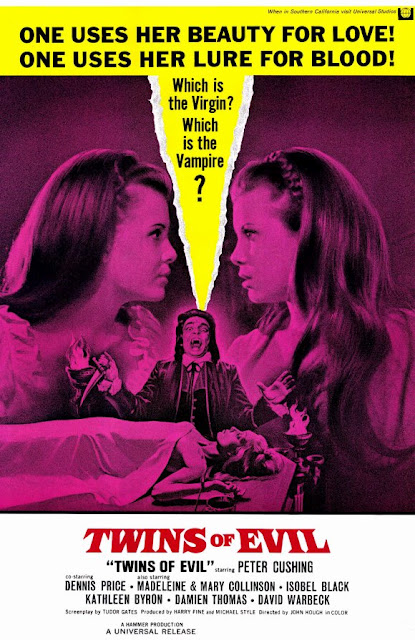 That carries over into the movies themselves. Twins is a fairly tepid affair, once again attempting to riff on Le Fanu’s “Carmilla”, as the cursed castle on the hill belongs to the Karnsteins, not the Draculas. The twins in question are the Collinson sisters, Mary and Madeleine, playing Maria and Frieda. After the death of their parents, they are unfortunate enough to be remanded to the care of their dour, neurotic puritan uncle, Gustav Weil (Peter Cushing), who spends his evenings finding young girls to burn at the stake. The rebellious Frieda takes a shine to Count Karnstein, whom she sees as her ticket out of Gustav-ville. Unfortunately for her, Karnstein has recently resurrected the infamous Carmilla, who vampirized him and then conveniently left the movie.