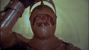 We start with that Paul Naschy standard, an opening scene with murder and a naked woman. She’s running bloody through some woods, pursued by a mounted man in a full suit of armor. This is the infamous Alaric de Marnac, last seen in Horror Rises From the Tomb, tracking down and killing his unfaithful wife. Okay, so it’s not reallythat Alaric de Marnac, but it’s still Paul Naschy.